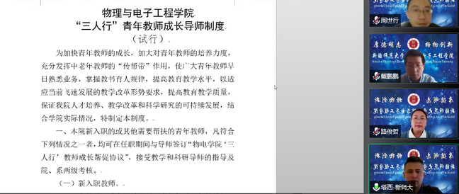 物理与电子工程学院副院长塔西买提·玉苏甫、戴鹏鹏分别对《物电学院“三人行”青年教师成长导师制度》《英国正版365官网领军岗和重点岗聘任实施办法(试行)》《2022 年新师学者及青年拔尖人才岗位选聘条件》进行了解读,帮助新进教师明确奋斗目标和发展方向。