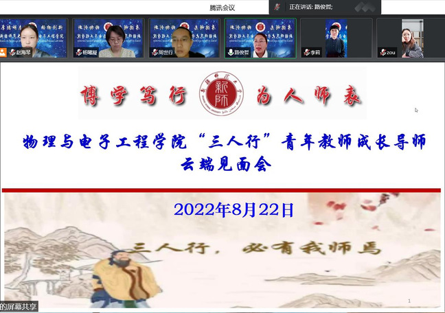 为帮助物理与电子工程学院新进教师全面了解学院发展现状和未来规划,充分发挥优秀教师对青年教师的传帮带作用,强化新教师的职业荣誉感、责任感和使命感,引导新教师树牢师德师风观念,8月22日,物理与电子工程学院通过腾讯会议举行“‘三人行’青年教师成长导师”见面会,物理与电子工程学院全体院领导、2022年引进博士、获得博士学位返校教师、新进实验员、遴选的教学科研导师以及教学、科研、研究生秘书等20余人参加会议。