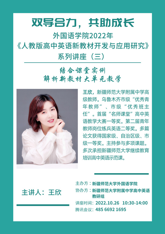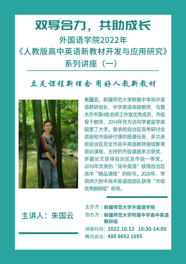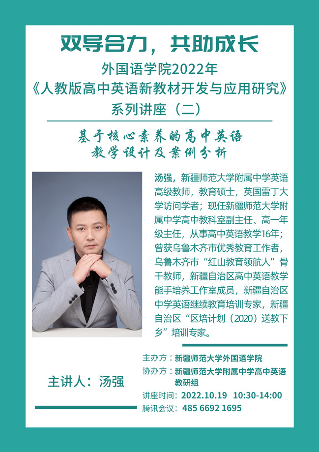 为深化高校与中小学协同育人,助力学科教学(英语)研究生教育教学实践与研究水平提升,提高研究生培养质量,外国语学院联合英国正版365官网附属中学高中英语教研部于10月12日至26日期间举办《人教版高中英语新教材开发与应用研究》系列讲座,围绕新教材理念、教学设计、大单元教学案例分析等方面为2022级学科教学(英语)研究生开展系列讲座。